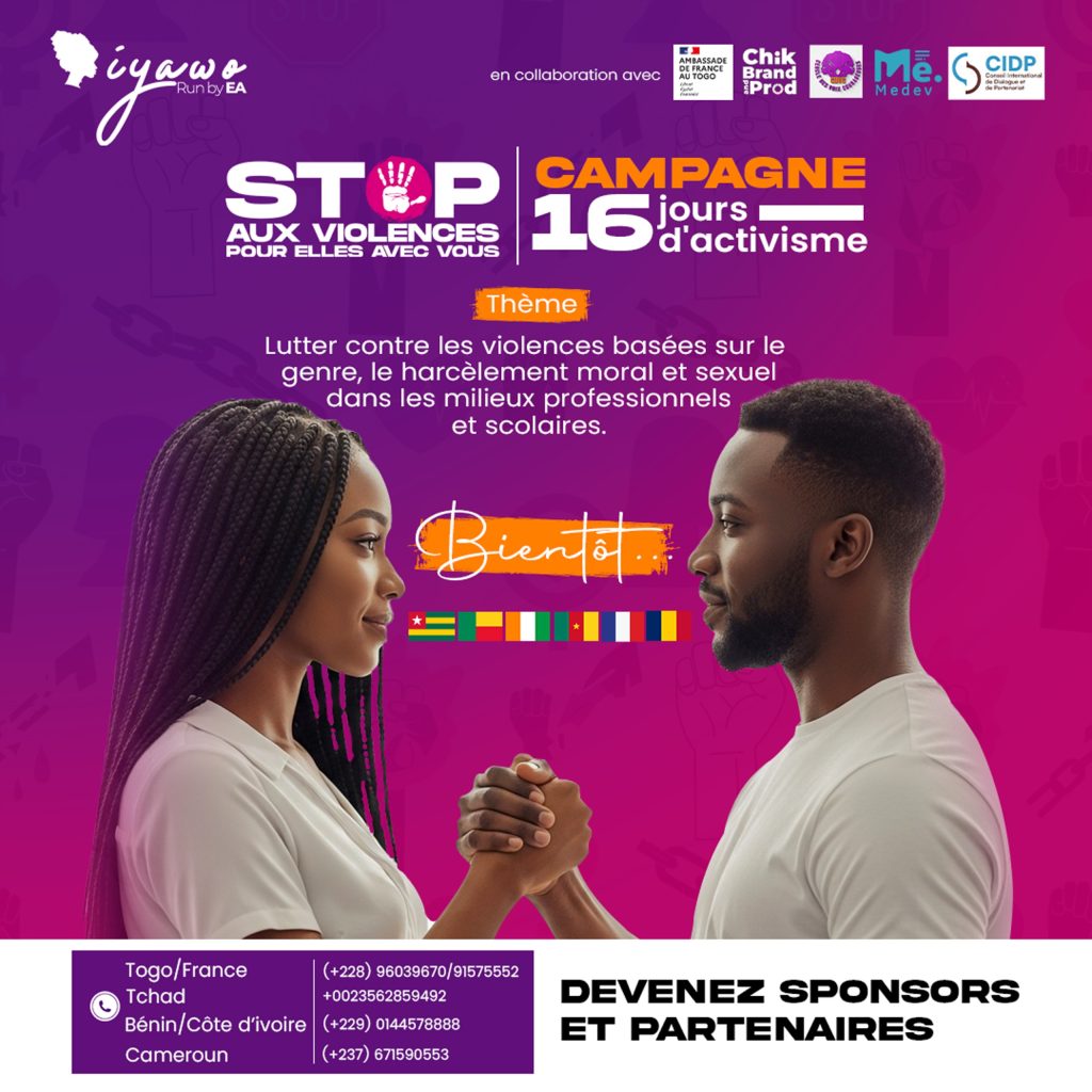 Portée par IYAWO (Togo), en partenariat avec l’Ambassade de France au Togo, CHIK Brand & Prod (Bénin & Côte d’Ivoire), le Cercle des Voix Courageuses (Cameroun), ONG MEDEV (Tchad) et le Conseil International de Dialogue et de Partenariat (France), cette nouvelle phase s’ouvre également à de nouveaux partenaires et sponsors désireux de contribuer à l’impact collectif.