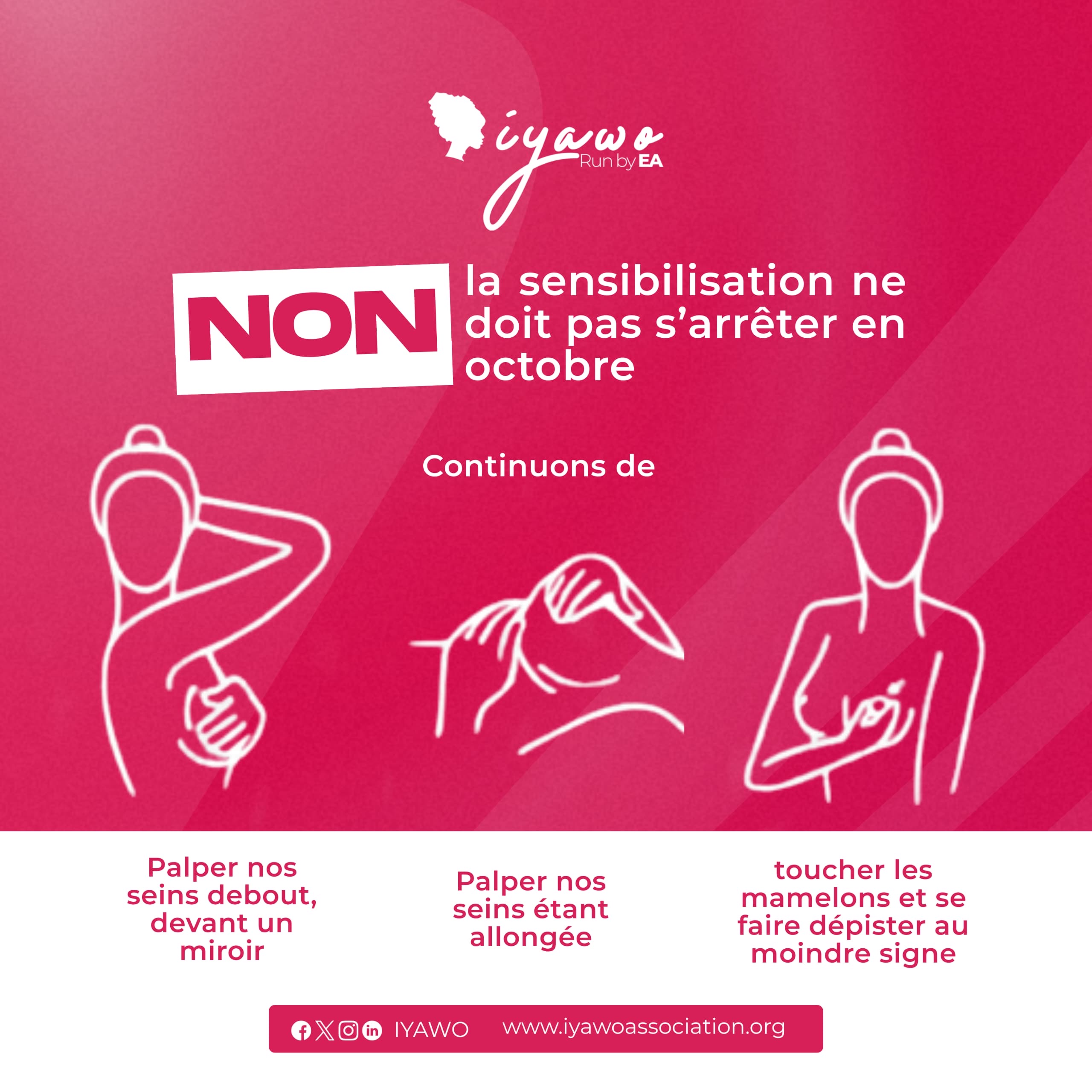 Chez #IYAWO, nous croyons que la sensibilisation au cancer du sein ne doit pas se limiter à un seul mois. Parce que la santé des femmes, c’est tous les jours, toute l’année. Chaque mois doit être rose dans nos cœurs, dans nos gestes, dans nos conversations.
